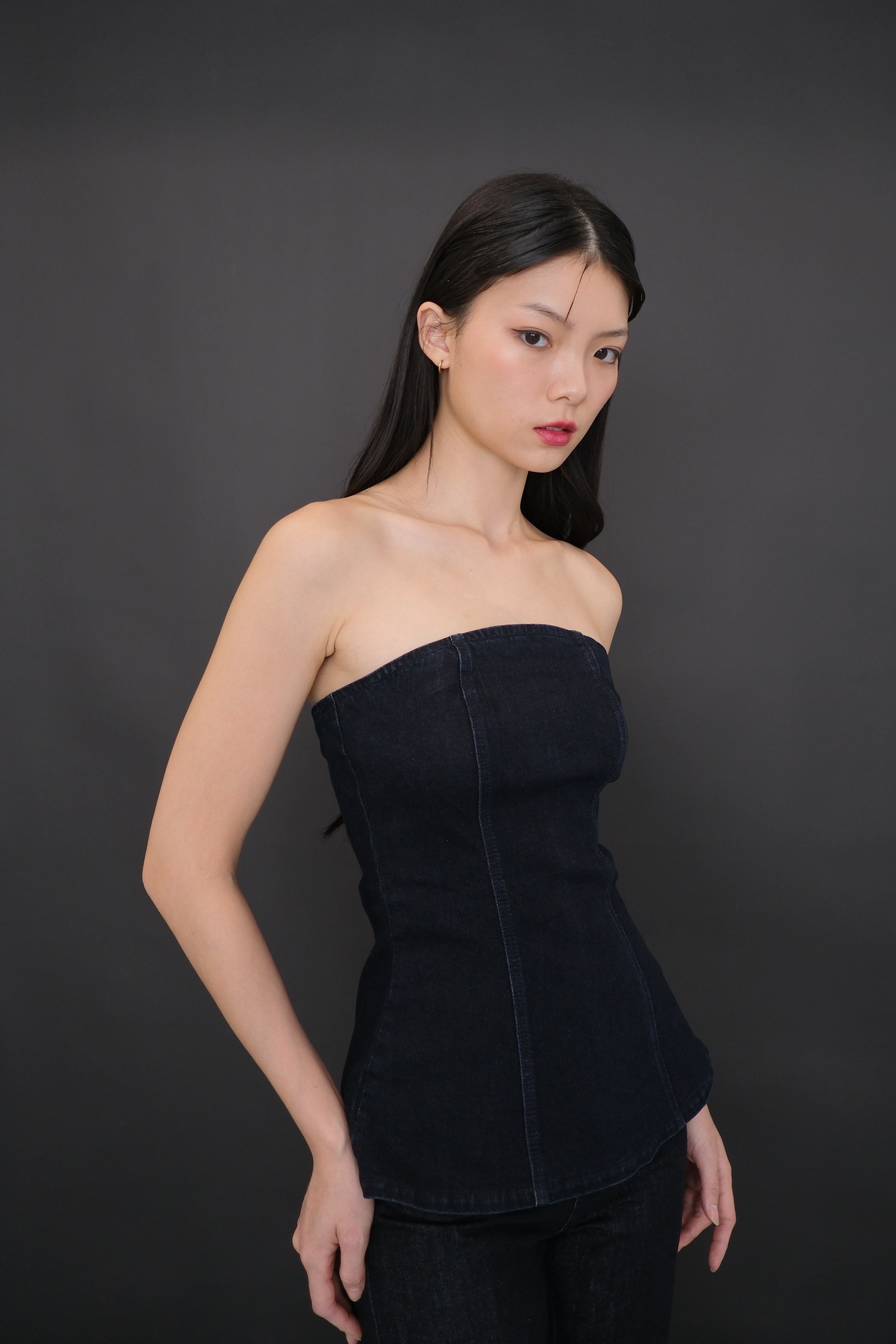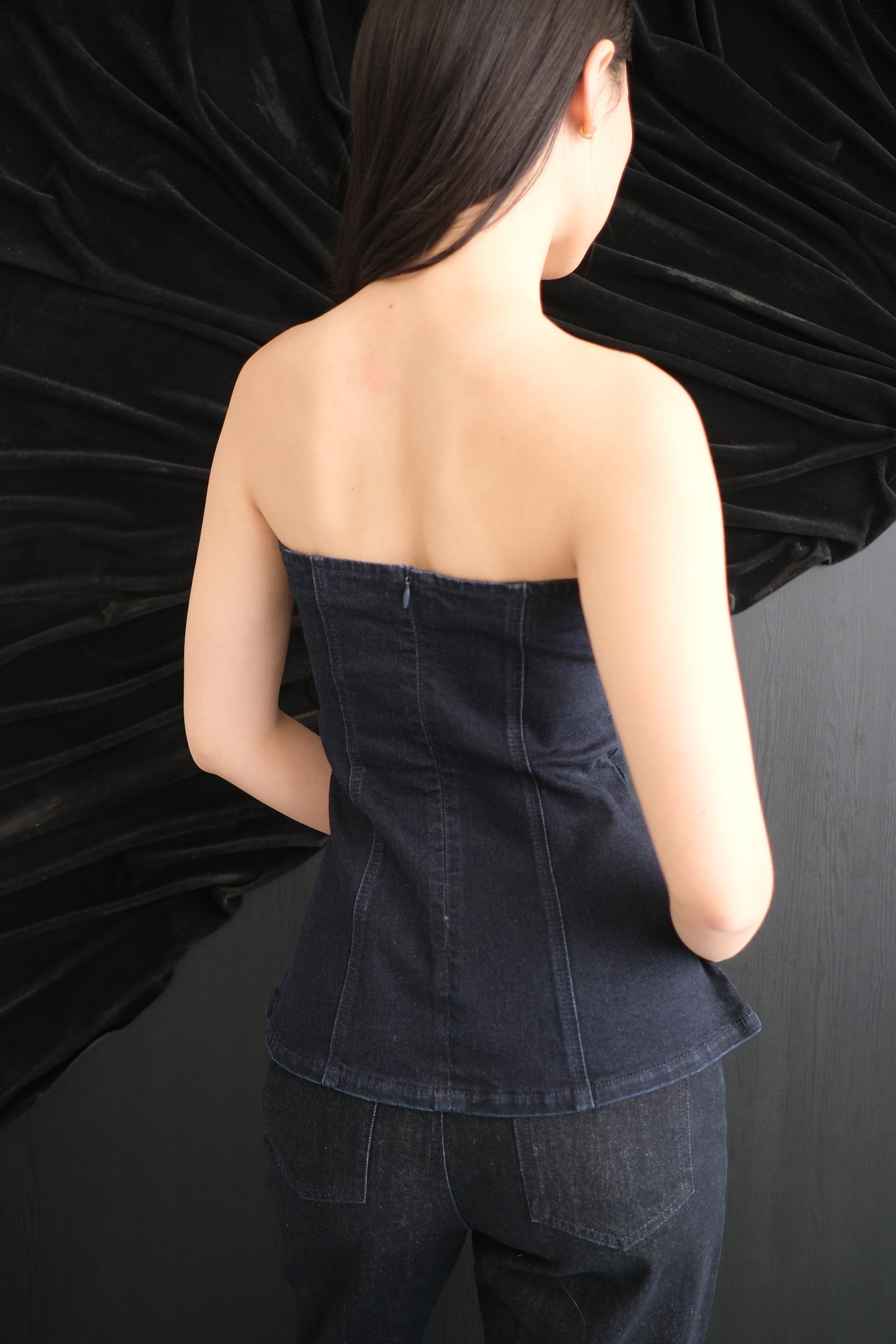 The Rumi longline denim tube top is a modern staple with subtle edge. Crafted from slightly stretchable material, it offers a sleek yet comfortable fit that contours your figure.